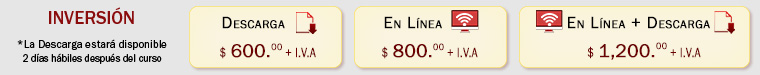 ADQUIÉRELO A TRAVÉS DE: O Realiza tu Inversión en: Grupo Sinergia Inteligente, Capacitación Profesional S.A.S. de C.V. RFC: GSI250509I46 Cuenta: 0125272955 CLABE: 012650001252729550 Envía tu comprobante de pago a: ventas@sinergiainteligente.com Para Mayores Informes, Comunícate con Nosotros: 222 237 2536 y 222 237 2234 |